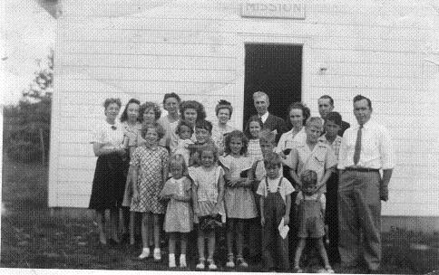 About 1947Fourth row - Mrs. Marian Hacker, unknown, Mrs. Pearl Duvall, Mrs. Rich (M. Y. Rich - the minister's wife) ?, visiting preacher unknown, Mr. Herbert Spencer.