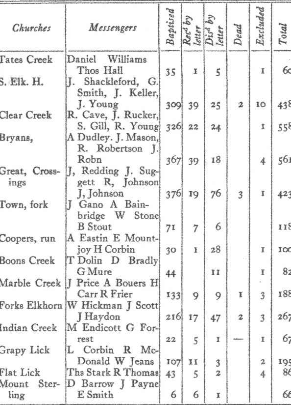 Editor's note: In 1800-1801 what has been labeled by many as the "Second Great Awakening" spread from western Kentucky to central Kentucky and there was rapid growth in the number of churches and the number of members in the churches of the Elkhorn Baptist Association. The following are records from the association for the years 1800, 1801 and 1802. As will be noted there was a total of 1,642 members in 1800; the following year, 3,211 members were added to these twenty-six churches. In 1802 ten churches and 457 members were added. This information is taken from W. W. Sweet's Religion on the American Frontier: The Baptists.