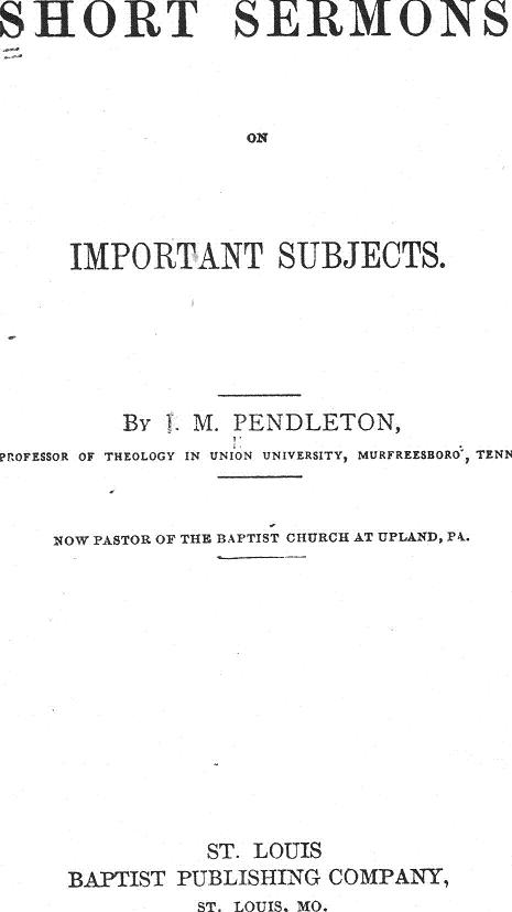 [From J. M. Pendleton, Short Sermons on Important Subjects, 1859. This book is from Southeastern Baptist Theological Seminary Library, Wake Forest, NC via ILL through Boone County Public Library, Burlington, KY. — Scanned by Jim Duvall]