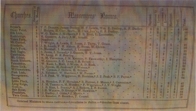 Much of the remainder of this history is from Licking Baptist Association Minutes and the Diary of Mary Bristow, Union. Additional information from the Minutes will be added. — jrd