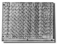 John Napier introduced a system called Napier's Bones, made from horn, bone or ivory the device allowed the capability of multiplying by adding numbers and dividing by subtracting.