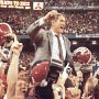 - Crimson White (Student Paper), Nov. 25, 1926. Alabama's first game was played in Birmingham on Friday afternoon, Nov. 11, 1892, at the old Lakeview Park. Opposition was furnished by a picked team from Professor Taylor's school and Birmingham high schools, with Alabama winning, 56-0. Early teams were a bit tougher than current squads, it seems, as the following afternoon Alabama played the Birmingham Athletic Club, losing 5-4 when Ross, of B.A.C., kicked a 65-yard field goal. Impossible though it may seem, this field goal was listed as a collegiate record at one time and Birmingham papers of the day featured its distance in writeups of the game. The gridiron sport rapidly caught the students' fancy and the game became a favorite with University athletes. In 1896 the University's board of trustees passed a rule forbidding athletic teams from traveling off the campus. The following season only one game was played and in 1898 football was abandoned at Alabama. Student opposition to the ruling was so strong that the trustees lifeted the travel ban and football was resumed in 1899, to continue without interruption until the first World War forced cancellation of the 1918 games. Alabama first gained national recognition in 1922 when the University of Pennsylvania was defeated, 9-7, in Philadelphia. The following season Wallace Wade became head coach and in 1925 led the Crimson Tide to its first undefeated and untied season and its first Rose Bowl invitation. On Jan. 1, 1926, an unheralded, underrated team from Tuscaloosa came from behind to upset Washington, 20-19, in the Rose Bowl and established a precedent of colorful play that Crimson Tide teams have continued to uphold.