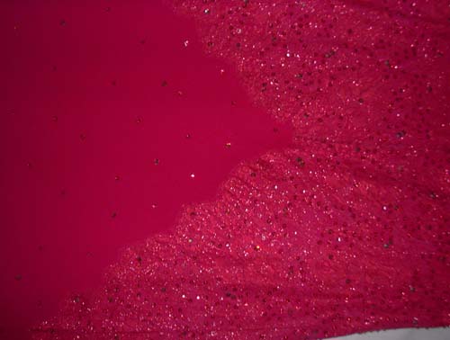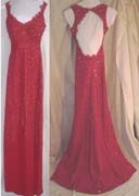 Description: Deep crimson red gown. Austrian Crystal, Rhinestone, sequence & beading over an iridescent lace which opens at the bottom to reveal the fabric underneath.