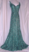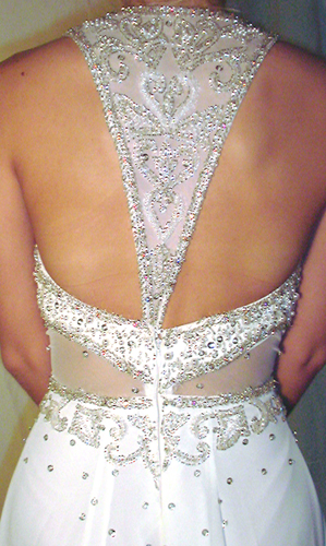 Description: White gown looks GREAT on stage! Bodice is fabric and mesh covered with silver and white liquid beading with pearl and sequence detail. The full skirt 'flows'. Unique triangle shapped back is mesh material detailed with silver beading. In good condition, needs minor repair at zipper. Padded. Fully lined.