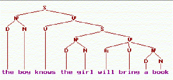 The Natural Language Parsing (NLP) unit will take words and construct them into sentences. It's input will come from the SR unit, but for testing purposes it will allow input from an ASCII file. Its output will be a parse tree, something like that diagrammed in Figure 1. A command-line parameter will tell the unit to print the tree in some meaningful text format. When spoken input is reliably parsed, this unit is complete.
