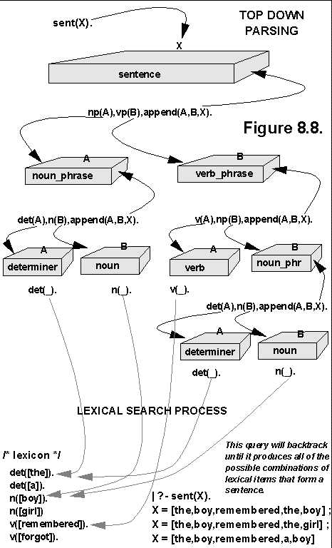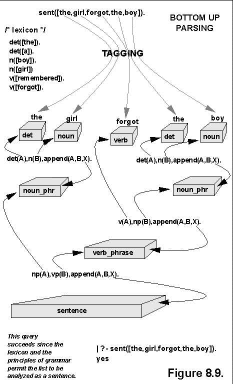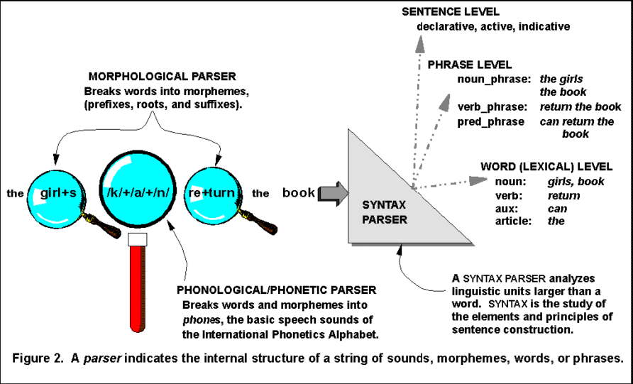 This view leaves the syntax parser a "black box", an item whose input and output are visible, but whose inner workings are not. He goes on to explain and illustrate two different basic methods of parsing. Top-down parsing, illustrated in Figure 3 begins with the concept of a sentence, and works down to the individual words. On the contrary, bottom-up parsing, illustrated in Figure 4 views all the words, and assembles them into phrases and finally sentences.