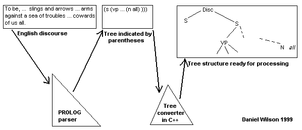 Lex and yacc should be able to process sentences in the format Dr. Dougherty suggests. That format would leave the simple sentence, "Girls put books in houses", expanded thus: (s (np (n girls)) (vp (v put) (np (n books)) (pp ( in) (np (n houses)) ))). I would need to do some serious work to see if lex and yacc can process this kind of "grammar", but at least the hardest work would have been done already.